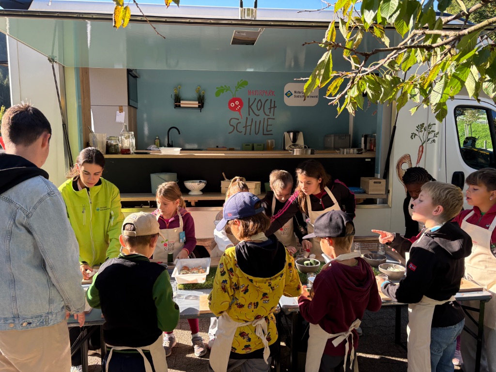 Ein besonderes Erlebnis hatten die beiden dritten Klassen der Buchenbrand-Grundschule: Die Naturpark-Kochschule war mit ihrem Foodtruck zu Besuch! Ziel des Projekts war es, den Kindern auf spielerische Weise Wissen rund um gesunde Ernährung, nachhaltige Lebensmittelverarbeitung und praktisches Kochen zu vermitteln.