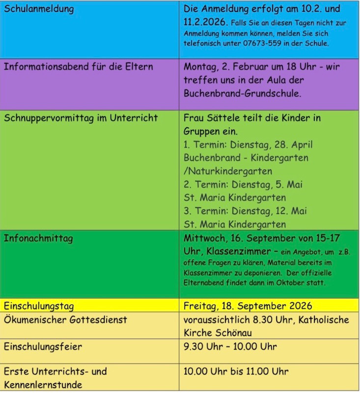 sehr herzlich begrüßen wir Sie an der Buchenbrand-Grundschule. Unten sehen Sie in der Übersicht die Termine zur Einschulung Ihres Kindes. Bitte nehmen Sie immer und gerne bei allen Fragen, Wünschen oder fehlenden Informationen Kontakt mit uns auf! Rufen Sie uns an (07673-559) oder schreiben Sie mir eine E-Mail (schulleitung@buchenbrand-grundschule.de). Wir alle freuen uns auf Ihr Kind und eine tolle Zusammenarbeit mit Ihnen als Eltern.