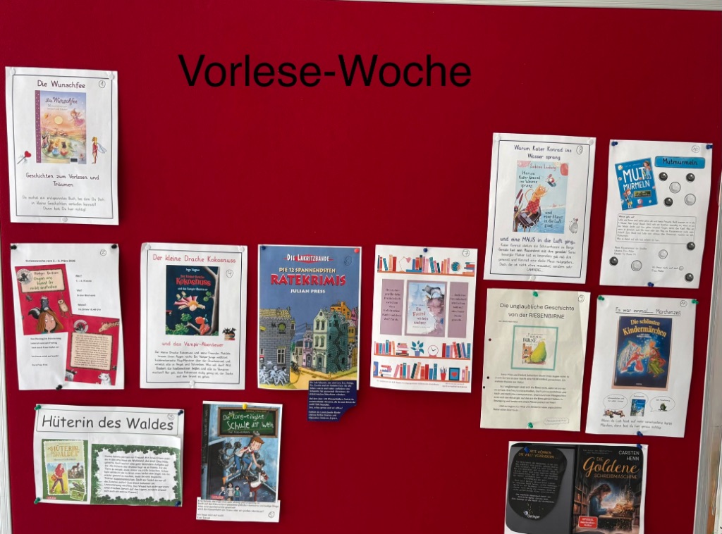 In der Woche vom 2. bis zum 6. März fand an unserer Schule die Vorlese-Woche statt. Die Lehrerinnen wählten jeweils ein Buch aus, aus dem sie den Kindern vorlasen. Insgesamt standen zwölf verschiedene Bücher zur Auswahl.